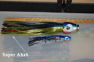 A straight runner that has no equal when pulled in the short or long ‘rigger position. Due to its taper nose the Mini Ahab has very tight action as it wobbles from side to side with a long smoke trail in tow. 4 oz., 9 1/2“, 7/0-9/0 hooks. 30-130 class tackle.